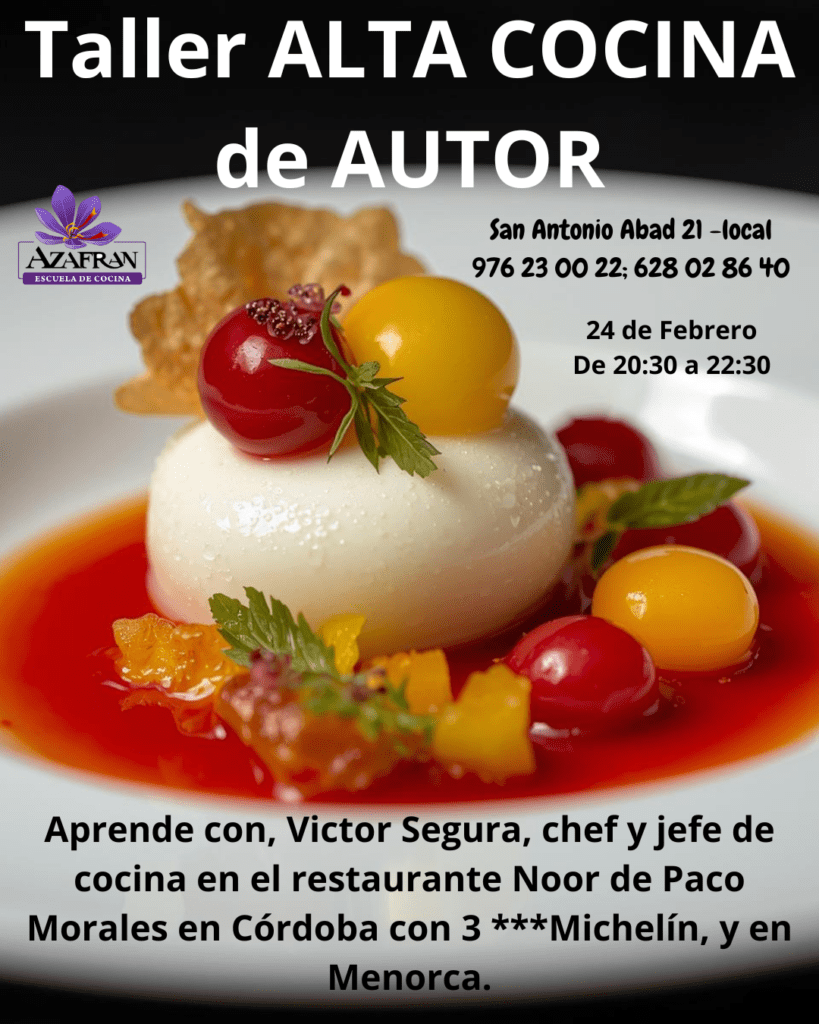 Aprende con nosotros y realizando tú mism@ las recetas, de alta cocina de autor, de la mano de un experto chef, Víctor Segura, que ha sido jefe de cocina en el restaurante Noor en Córdoba con 3 ***Michelín, y en Menorca.